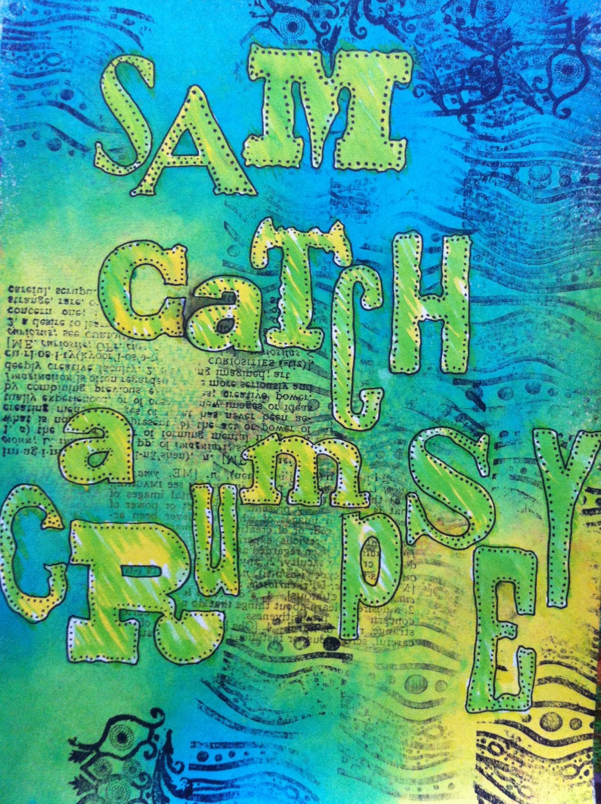 I have to say that she makes it look effortless, whereas I had a few crises of confidence whilst doing it. I used the Tim Holtz Random Alphabet mask to block out the lettering, and then sprayed Dyelusions sprays over the top. After mopping up the excess, I stamped with Stampers Anonymous Tattered Elements and a Moulding Mat Lava Lamp. Then I removed the masks and coloured in the lettering with a brush and Dyelusions (as I had seen Dyan do). Then I did some extra detail with a Sharpie.